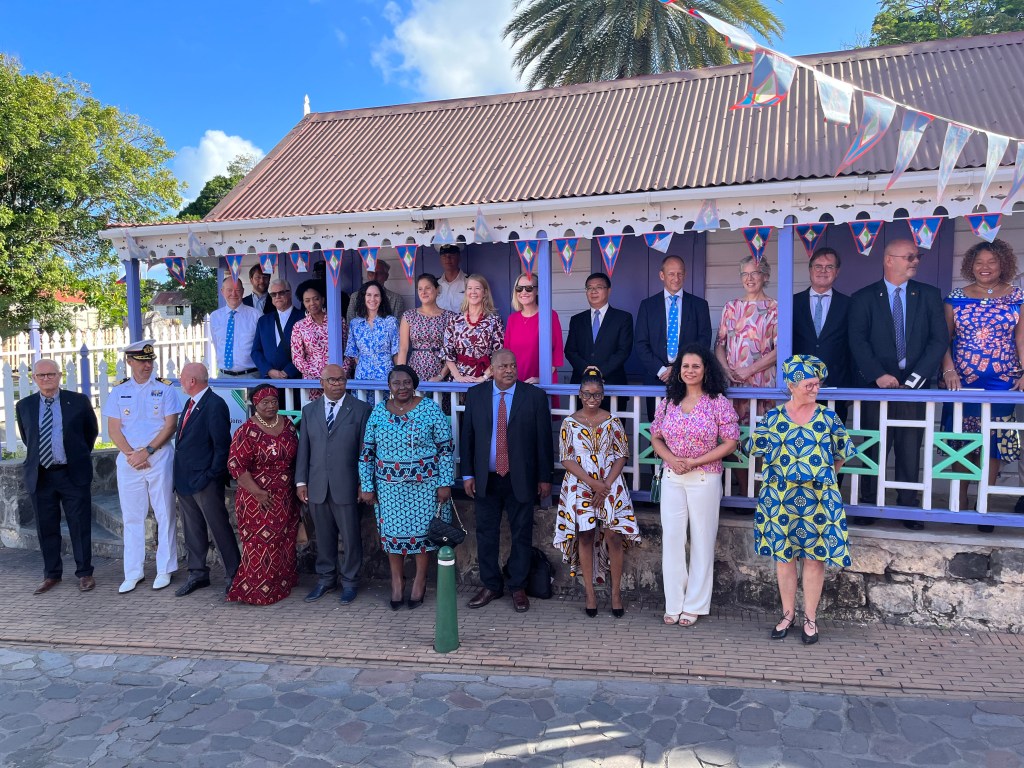 Een zelfgemaakte statiefoto met ondermeer de vertegenwoordigers van de verschillende landen, het eiland zelf en diverse diensten en uiteraard Anja in haar mooie outfit (uiterst rechts eerste rij)