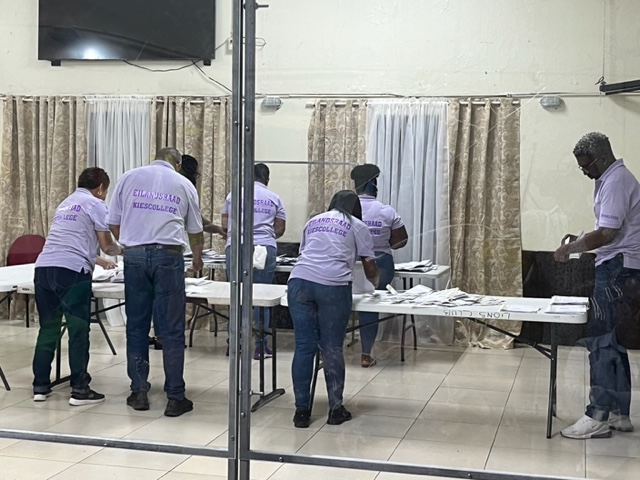 Hoe zijn de verkiezingen verlopen? Heel anders dan ik gewend ben in Nederland. Er waren twee goed beveiligde terreinen rond de twee stemlokalen; de sporthal en de zaal op het evenemententerrein. Er was veel aan gelegen om de onwenselijke directe beïnvloeding van de stemmers zoveel als mogelijk te beperken. Zo lukte het mij wel bij de stemlokalen te komen, maar moest ik me duidelijk presenteren als de griffier, die geïnteresseerd was in de gang van zaken. Naast beveiligers was ook de politie goed present. Daarnaast werd er ook op gelet dat kandidaten, die op de lijsten stonden geen partij-kleding droegen als ze gingen stemmen. Daar werd streng op gelet en dat leidde wel eens tot zware discussies. Je merkte ook aan alles dat de ambtenaren, die direct betrokken waren bij de verkiezingen een zware taak hadden. Stemmen doet er echt toe op het eiland en het vasthouden aan de regels kan wel eens tot vervelende reacties leiden bij hen, die de randen van de wetgeving willen opzoeken of daarover heen gaan. De medewerkers stonden echt onder druk derhalve.