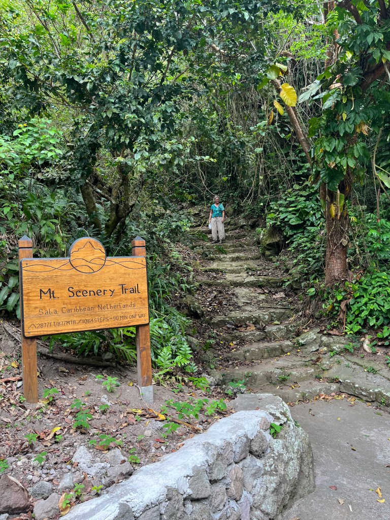 De laatste dag hebben we gebruikt om de rest van het eiland te bekijken. We bezochten de kleinste commerciële luchthaven ter wereld met een strip van 400 meter. Piloten hebben een speciale opleiding nodig om er te mogen landen en opstijgen. In de ruim 50 jaar van het bestaan is er nog nooit een ongeluk gebeurd. We wilden nog Mount Scenery beklimmen, een tocht van meer dan 1000 treden. We wisten dat de kans op een mooi uitzicht boven klein was, omdat de top van de berg eigelijk altijd in de mist zit. Dat zien we al vanaf Statia. Het klimpad ligt in een tropisch regenwoud met lianen en een keur aan tropische bomen en planten. Een trap van 1000 treden is op zich al lastig maar hier zijn de treden eerst laag (15 cm) en dan hoog (40 cm) en dan weer laag, plus soms droog, soms nat en veel met bladeren bedekt. Daarmee is het een zware tocht, zeker voor een stel ongeoefende wandelaars zoals wij. Gelukkig staat er hier en daar een bankje met overkapping en lieten we ons regelmatig inhalen door andere wandelaars zodat we extra rust hadden vooral als we een praatje konden aanknopen. We hebben de top gehaald! We hadden geen uitzicht. Na een net zo’n moeilijke afdaling kwamen we doorweekt aan in Windwardside. We konden in het hotel blijven totdat we terug moesten naar de haven. Tijdens de terugvaart kotsmisselijk geworden en nog twee dagen daarna nauwelijks kunnen lopen door spierpijn. Maar who cares? Saba,“the Unspoiled Queen”, heeft een plekje veroverd in ons hart.