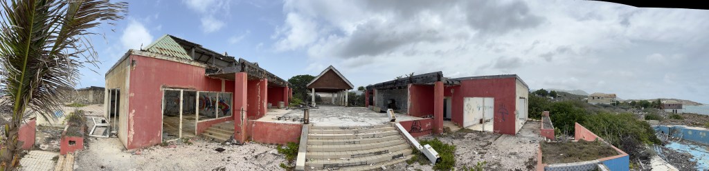 Een lokaal restaurant in Grand Casse op het franse gedeelte Zaterdag kopen we een barbecue; een kleine Kamado. Die kan niet in de rolkoffer maar gaat als apart pakket mee. Daarna kopen we eten voor een picknick op een mooie plek. Overigens typisch frans: stokbrood, pate en kaas. Wijn lukte niet maar wel lekker biertje en fruitsap. We vonden een plek met het uitzicht over zee bij een ruïne van een hotel. Gevolg van Irma. We zitten op het terras van een ruïne die ooit een luxe hotel moet zijn geweest. De auto zetten we voor de ingang waar ooit de koffers werden uitgeladen. Daar is nog een restant van een dak zodat de auto minder heet wordt. Want heet is het ook op Sint Maarten! Daarna zoeken we de sale en braderie in het centrum van Marigot. Eerst het overdekte winkelcentrum Le West Indies en daarna de straatjes in het centrum. We kopen kleren die niet op ons lijstje staan (maar ja goedkoop en leuk dus…..). In het hotel bekijken we hoe alles mee moet: 2 rolkoffers, een rugzak, een koeltas voor de etenswaren en een zware doos. Dat betekent dus improviseren.