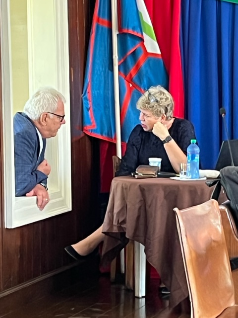 De dag begint om 08.00 uur met een officiële zitting in de raadszaal van het eilandsbestuur, waar de fractievoorzitters hun kijk op het nu en de toekomst van Bonaire verwoorden. Gezien de toon heel gewichtige toespraken, maar gezien de taal, het Papiaments voor mij totaal onbegrijpelijk. Maar de entourage waarbinnen dit plaatsvindt is indrukwekkend. Ook mijn collega-griffier Shuzelle ziet er prachtig uit in een veelkleurige jurk.