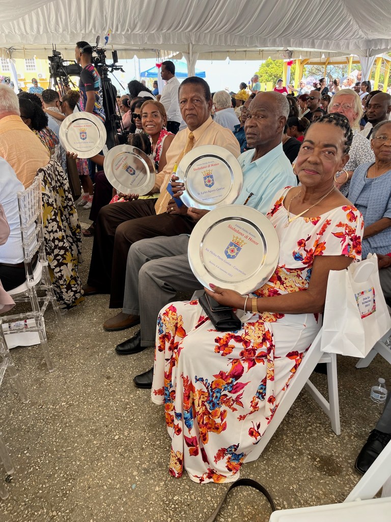 de laureaten… Het ochtendprogramma eindigde met een voorstelling van wat de jeugd van Bonaire zoal onderneemt op sportief en cultureel gebied en waarin ook een plek was ingeruimd voor jongeren met een lichamelijke of geestelijke handicap. Uiteraard was er daarna onder de schaduw van de bomen in de tuin van het Bestuurscollege een receptie, waarbij duidelijk was dat vanwege de afgelopen corona-jaren velen elkaar sinds lange tijd weer eens echt konden ontmoeten. Wij hadden vooral een genoeglijk contact met de consuls van Mexico en België (!) met wie we een soort van afspraak hebben gemaakt om elkaar weer te ontmoeten op de vlagdag van Statia in november. Zij nemen dan ook de consul van de VS mee………..
