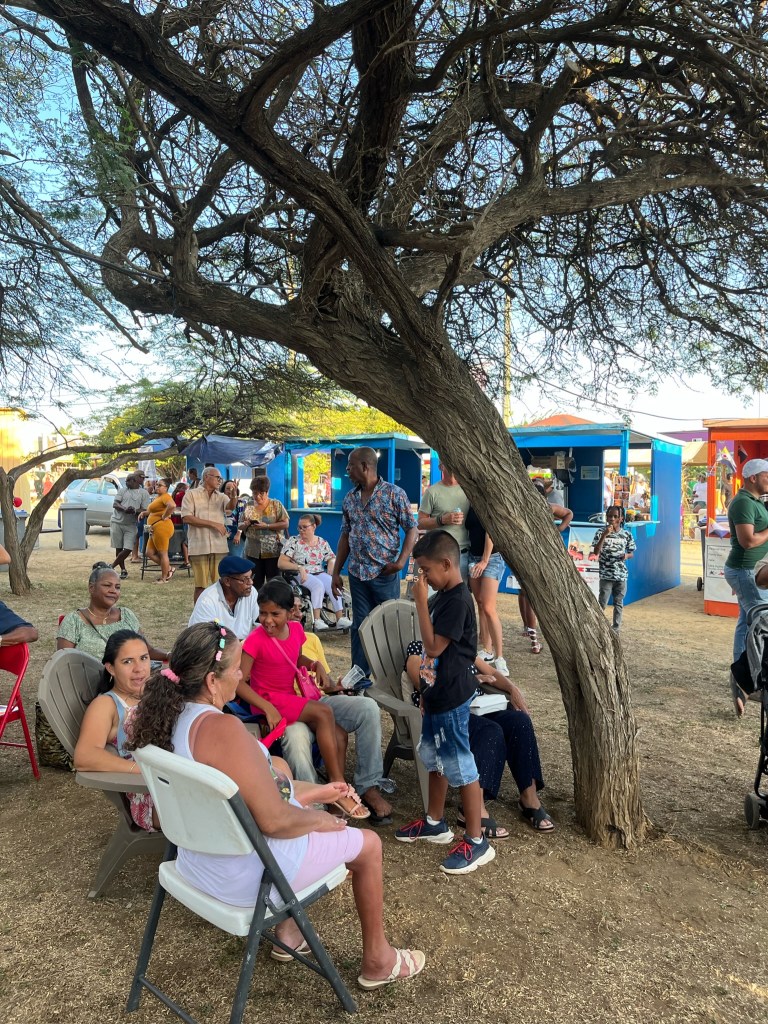 Het middagprogramma was op locatie oftewel in een wijk in Kralendijk. Elk jaar is een andere wijk of dorp binnen Bonaire gastheer van het middagprogramma, dat vergelijkbaar is met Koningsdag in Nederland: veel eettentjes en verkoop van spullen en uiteraard de nodige optredens. Op het terrein staat een grote tamarindeboom en daar is het plein dan ook naar vernoemd. Bij een van de kraampjes kon je poffertjes eten, maar echt druk was het daar niet toen wij er eind van de middag waren. ‘s Avonds was er veel muziek en een gezellige drukte, hebben we gehoord. Toen was bij ons de energie al op. De feestdag was immers al vroeg begonnen.