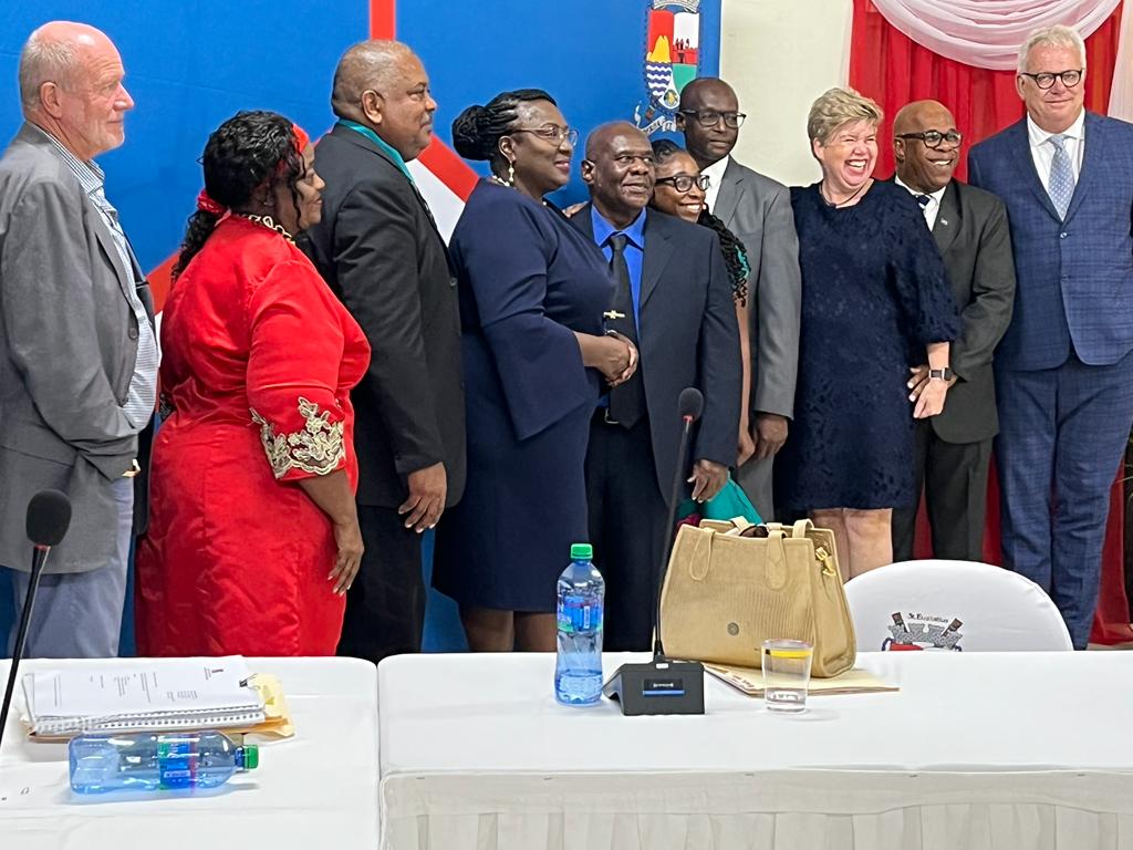 De statiefoto: eilandraadsleden en bestuurscollege Afgelopen dinsdag, 4 oktober dus, zijn de commissioners benoemd, voor het eerst sinds ruim 4 jaar. Een feestelijke gebeurtenis op een aparte lokatie (Lions Den genaamd), waar ook het carnaval en andere buitenactiviteiten plaatsvinden. De zaal was gevuld met allemaal genodigden en velen waren op hun paasbest gekleed. Er waren vertegenwoordigers van andere eilanden, zoals Saba, de Rijksvertegenwoordiger (vergelijkbaar met onze commissaris van de Koning) was aanwezig en een hooggeplaatste ambtenaar van het ministerie van BZK gaf ook acte de présence. Het is een waardige vergadering geworden en het belang ervan is onderstreept door emoties bij vele aanwezigen.