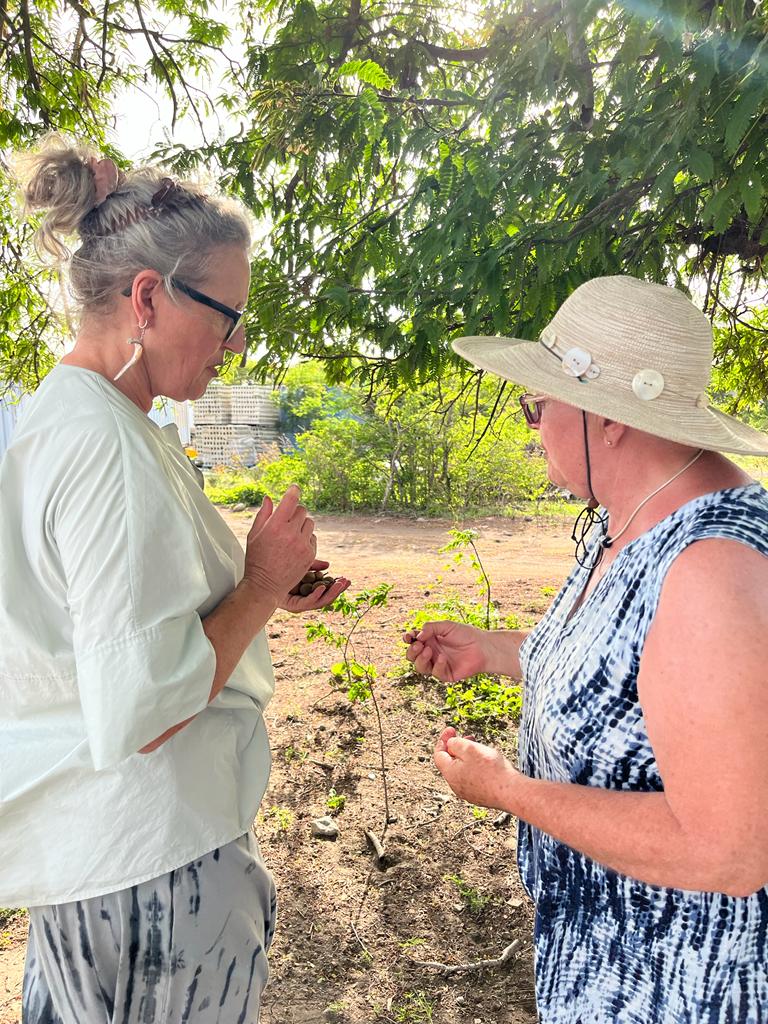Anja wordt wegwijs gemaakt in de tamarinde peul Maar we kwamen ook een jong gezin tegen op het strand. Zij is verbonden aan het ziekenhuis, waar ze zich heeft gespecialiseerd in de behandeling van diabetici en hij vanuit hier via internet werkzaam is voor de veiligheid van Schiphol. Twee van hun drie jonge kinderen bezoeken de lokale basisschool en spreken na vier maanden inmiddels goed engels. Hun verblijf duurt nog anderhalve week. Dat vinden ze heel jammer. Hoewel het ziekenhuis graag haar verblijf langer zou zien, is het vooral Schiphol die vraagt om een snelle terugkeer. Dat gaat hen erg aan het hart. Dat geldt ook voor onze buurman, die de ziekenhuisdirecteur blijkt te zijn, en die het jammer vindt haar te moeten laten gaan.