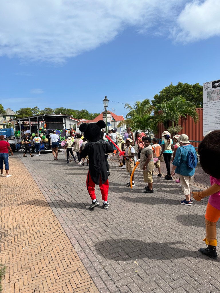 Het carnaval in Nederland duurt officieel 3 dagen maar is in de laatste 40 jaar uitgegroeid tot 6 dagen: van donderdagavond tot en met dinsdagavond. Ik had collega’s die de hele week vrij namen want na de dinsdagavond hadden ze nog wel 2 dagen nodig om hun stem weer terug te vinden. Op Statia duurt carnaval een week en echte feestvierders nemen die week ook vrij. Dat moet wel want alle feesten beginnen volgens het programma om 20.00u maar in de praktijk veel later en soms pas om 24.00u. De feesten worden allemaal op een festivalterrein gehouden in de open lucht. Ik heb oordopjes nodig gehad om te kunnen slapen. De week carnaval is ingebed in een feestperiode van 5 weken: het programma van carnaval loopt van vrijdag 1 juli tot en met dinsdag 6 augustus. Daarvan kun je de 7 feesten in de eerste drie weken zien als voorproefje en de 3 activiteiten in de laatste 7 dagen als afscheid. We zijn gaan kijken naar drie onderdelen: de kinderoptocht, de miss carnaval verkiezing en de grote optocht. Achteraf kan ik zeggen dat de kinderoptocht een kopie is van de grote optocht. De kinderen zijn verkleed in lycrapakjes met veel veren erop en ze dansen achter de muziekwagen aan. Het is echt een kwestie van jong geleerd is oud gedaan want bij de grote optocht heb ik dames gezien die zeker 70 jaar waren en die nog net zo soepel in de heupen waren en die graag hun pak, hun lijf en hun moves wilden laten zien. En alles was ook te zien: de pakjes waren laag uitgesneden van boven en hoog opgesneden van onderen, maar wel allemaal een panty aan dus het was niet bloot. We stonden aan het begin van de optocht. Er was live muziek, mooi weer en iedereen had er zin in. Toen de stoet voorbij was, gingen de omstanders niet naar huis. Wij begrepen dat de stoet hier weer voorbij kwam op de terugweg. Iedereen bleef, wij ook. Toen de stoet voor de tweede keer langskwam was de stemming onder de dansers nog veel beter. Een aantal dansers had de schoenen uitgetrokken en kwam voorbij op pantyvoeten. Toen ontdekte ik ook miss carnaval die in de achterste groep meeliep. Ze poseerde trots toen ik een foto nam.